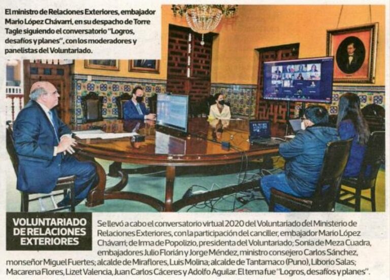 El 23 de septiembre de 2020 se realizó el conversatorio nacional virtual “Logros, desafíos y planes”, organizado por el Ministerio de Relaciones Exteriores para fortalecer el Voluntariado del MRE. Lo presidió el entonces canciller, embajador Mario López Chávarri, y contó con la presencia del embajador Allan Wagner Tizón, director de la Academia Diplomática del Perú, junto con autoridades locales, representantes del voluntariado y aliados estratégicos.